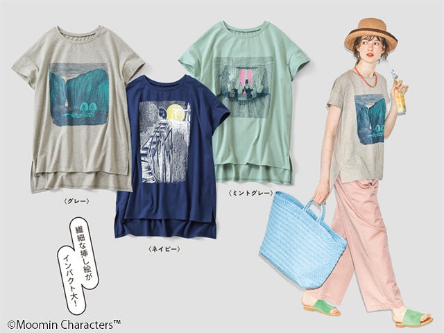 インパクトのあるイラストのデザインが魅力のTシャツ。小説『ムーミンパパ海へいく』からセレクトされた挿し絵が大胆にプリントされています。デザインは〈グレー〉〈ネイビー〉〈ミントグレー〉の大人っぽく着こなせるクスミカラーの3種類です。長めのチュニック丈のすその前後差とサイドスリットも◎。ボディラインもさりげなくカバーしながら、一枚で、おしゃれに着こなせます。
