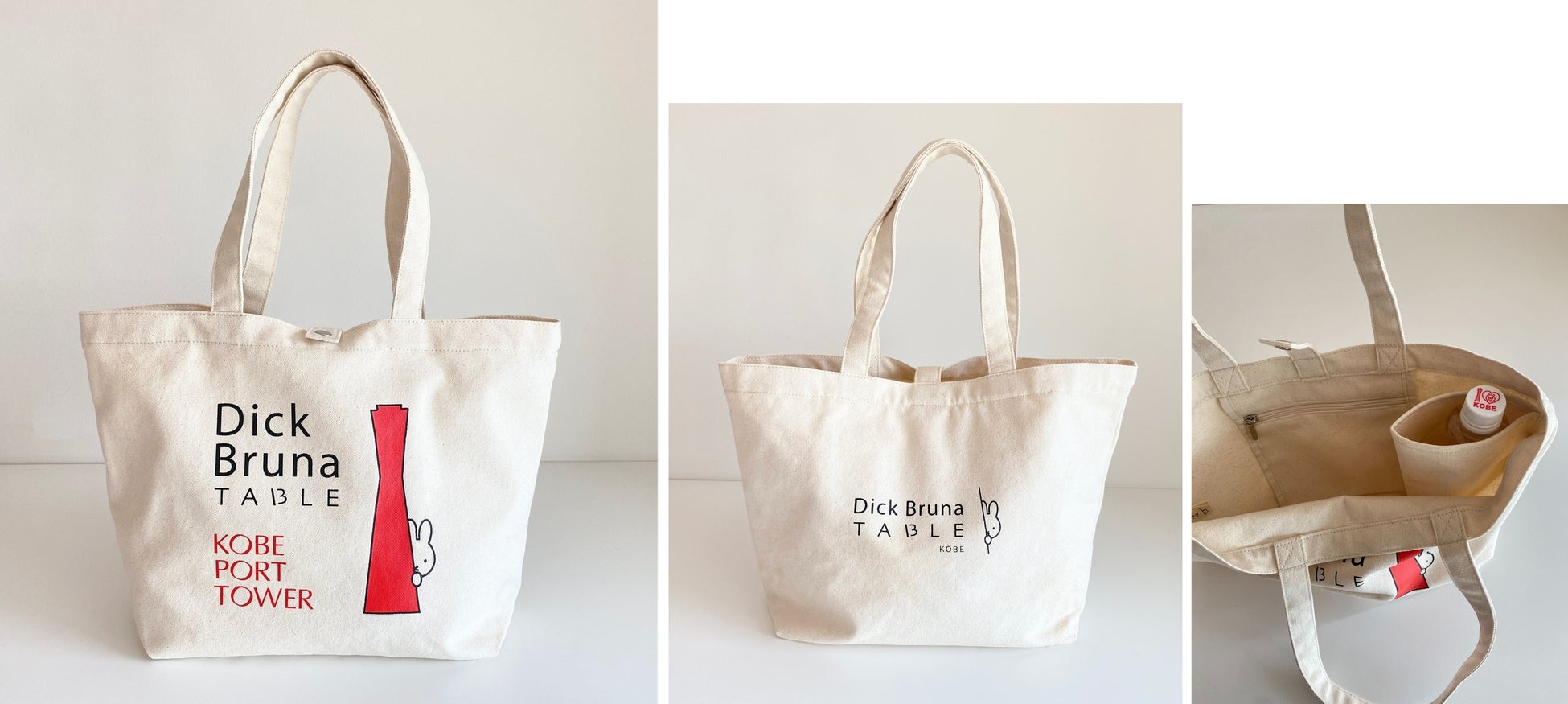「KOBE PORT TOWER × Dick Bruna TABLE in KOBE Waterfront」のコラボレーションから生まれた限定トートバッグ。表は赤が映えるイベントロゴ、裏面は「Dick Bruna TABLE」ロゴのシンプルデザインです。ドリンクホルダーとファスナー付き内ポケットなどの仕様とサイズは「Dick Bruna TABLE」で人気の帆布トートと同じでなので、毎日の相棒にぴったりです。