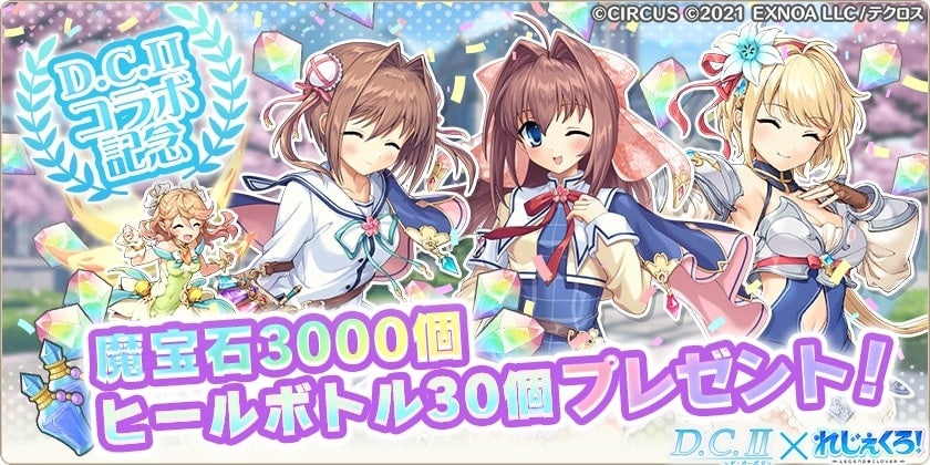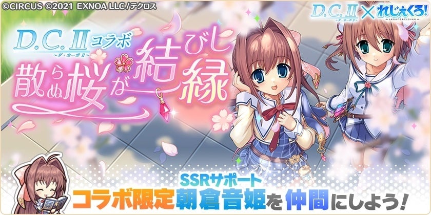 合同会社EXNOA(本社:東京都港区、CEO:村中 悠介、URL:https://games.dmm.com/)が運営するDMM GAMESにおいて、真の英雄となる王道ファンタジー『れじぇくろ!~レジェンド・クローバー~』(https://www.legend-clover.net/)は、「D.C.II 〜ダ・カーポII〜」とのコラボイベント「D.C.II 〜ダ・カーポII〜コラボ 散らぬ桜が結びし縁」を開催したことを発表した。コラボキャラとして「朝倉由夢」「朝倉音姫」、さらに制服を身にまとった「カエサル」「ハデス」も新登場。また、コラボを記念した最大50連分のガチャを無料で引くことができるガチャキャンペーンも開催する。