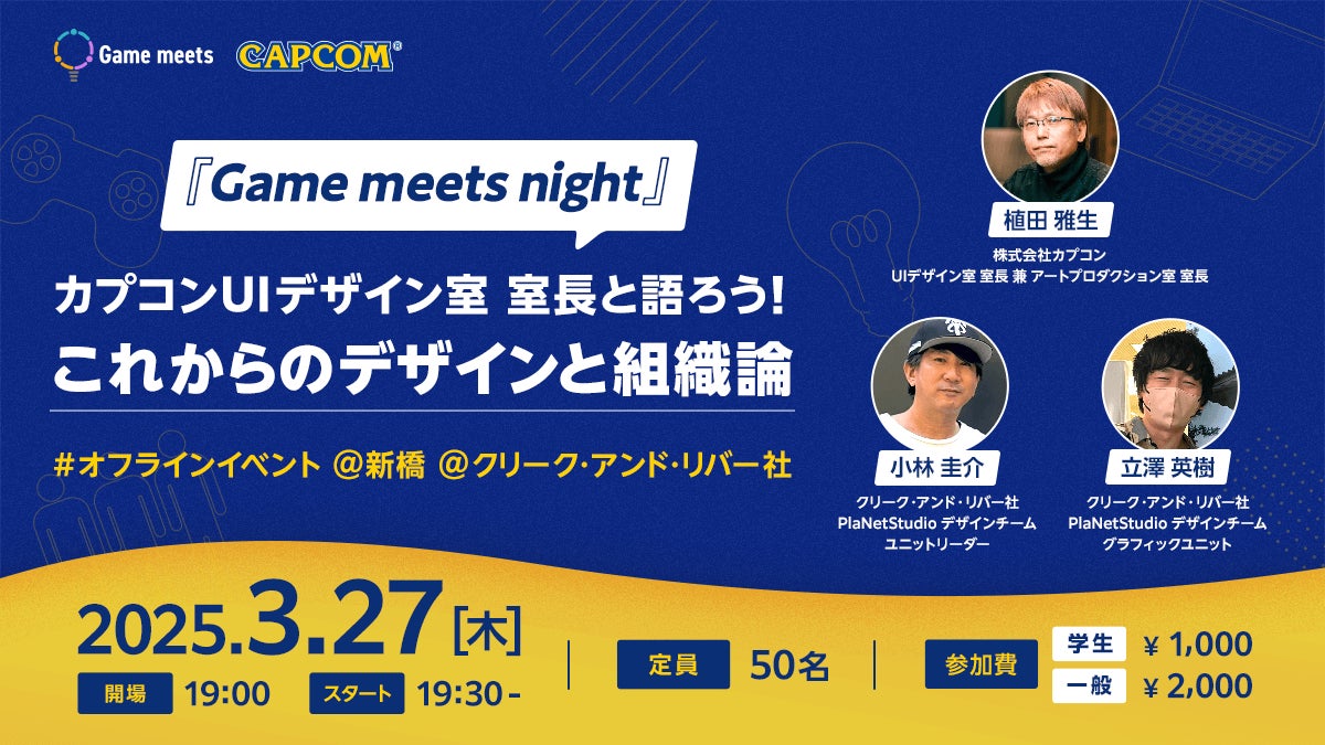株式会社クリーク・アンド・リバー社(C&R社)が主催するクリエイティブ共創コミュニティ「Game meets」は3月27日(木)、ゲームクリエイターの方を対象に、セミナー「【Game meets NIGHT】 ~カプコンUIデザイン室 室長と語ろう!これからのデザインと組織論~」を開催します。なお、本セミナーはC&R社本社(東京都港区新橋)にて開催します。