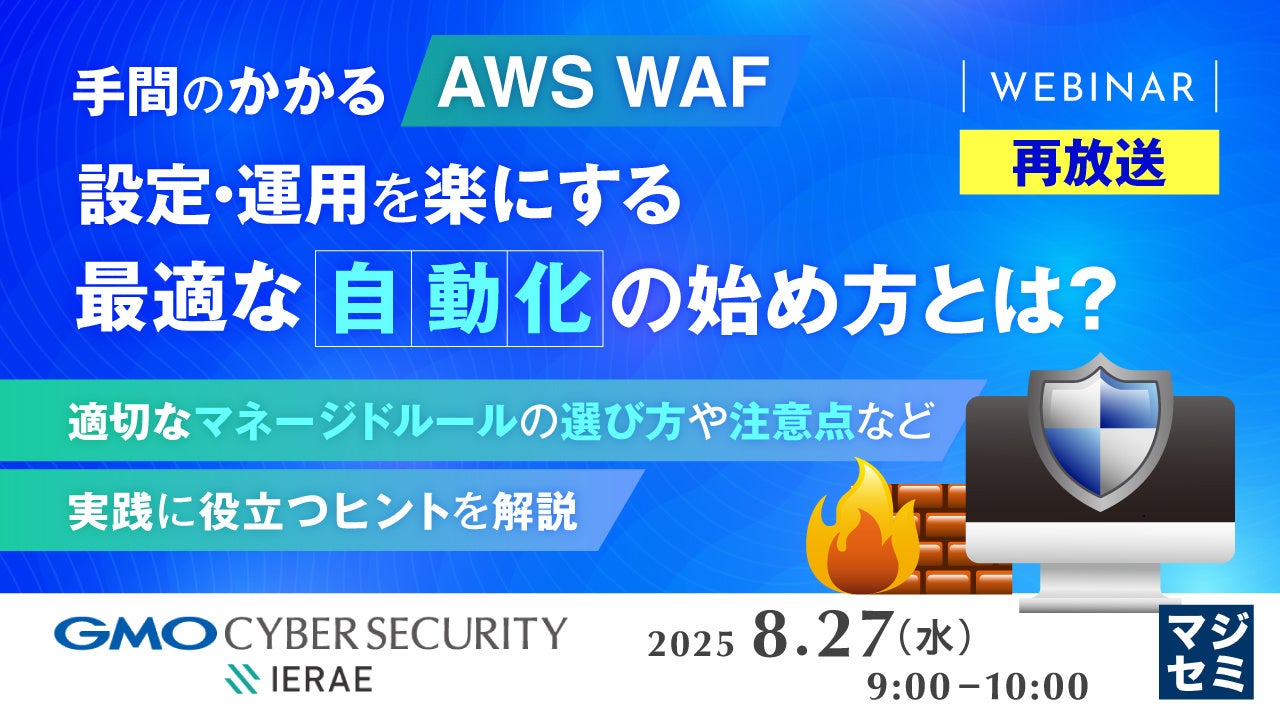 マジセミ株式会社は「【再放送】手間のかかる「AWS WAF」設定・運用を楽にする、最適な「自動化」の始め方とは?」というテーマのウェビナーを開催します。