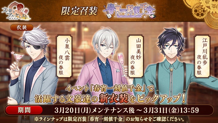 文豪の「衣装」や、会派に装備する事で能力を強化できる「装像」などが入手できるコンテンツ「召装」に、限定召装『春宵一刻値千金』が期間限定で登場します。この召装では、イベント『調査任務「春宵一刻値千金」』で活躍する「小泉八雲」「山田美妙」「江戸川乱歩」の新衣装を一定の確率で入手できます。
