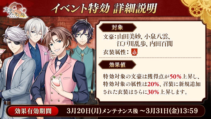 期間中「山田美妙」「小泉八雲」「江戸川乱歩」「内田百閒」の衣装を編成して潜書すると、得点の獲得数がそれぞれ50%上昇します。また、「火」属性の衣装を編成して潜書すると、得点の獲得数がそれぞれ20%上昇します。