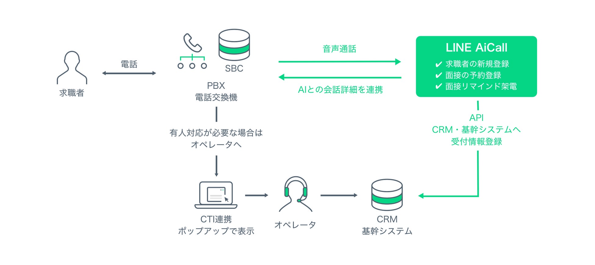 この度、UTグループへの「LINE AiCall」の提供を9月26日(月)より開始しました。人材サービス事業を手掛ける同社では求人案件の発生状況や応募者の応募タイミングなどによるコンタクトセンターの運営体制の変化が激しく、月間で約数万件にも及ぶコール数に応じたオペレータの人員調整などのコストが発生していましたが、「LINE AiCall」の導入により、応募者の新規登録や面接の予約登録などをAIがサポートすることで、激しい運営体制の変化にも対応可能な採用コンタクトセンターの安定運用を実現いたします。