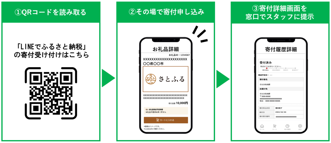 ※1 LINE公式アカウント「LINEでふるさと納税」から株式会社さとふるが運営するサービスサイト「LINEでふるさと納税 Powered by さとふる」へ遷移します。