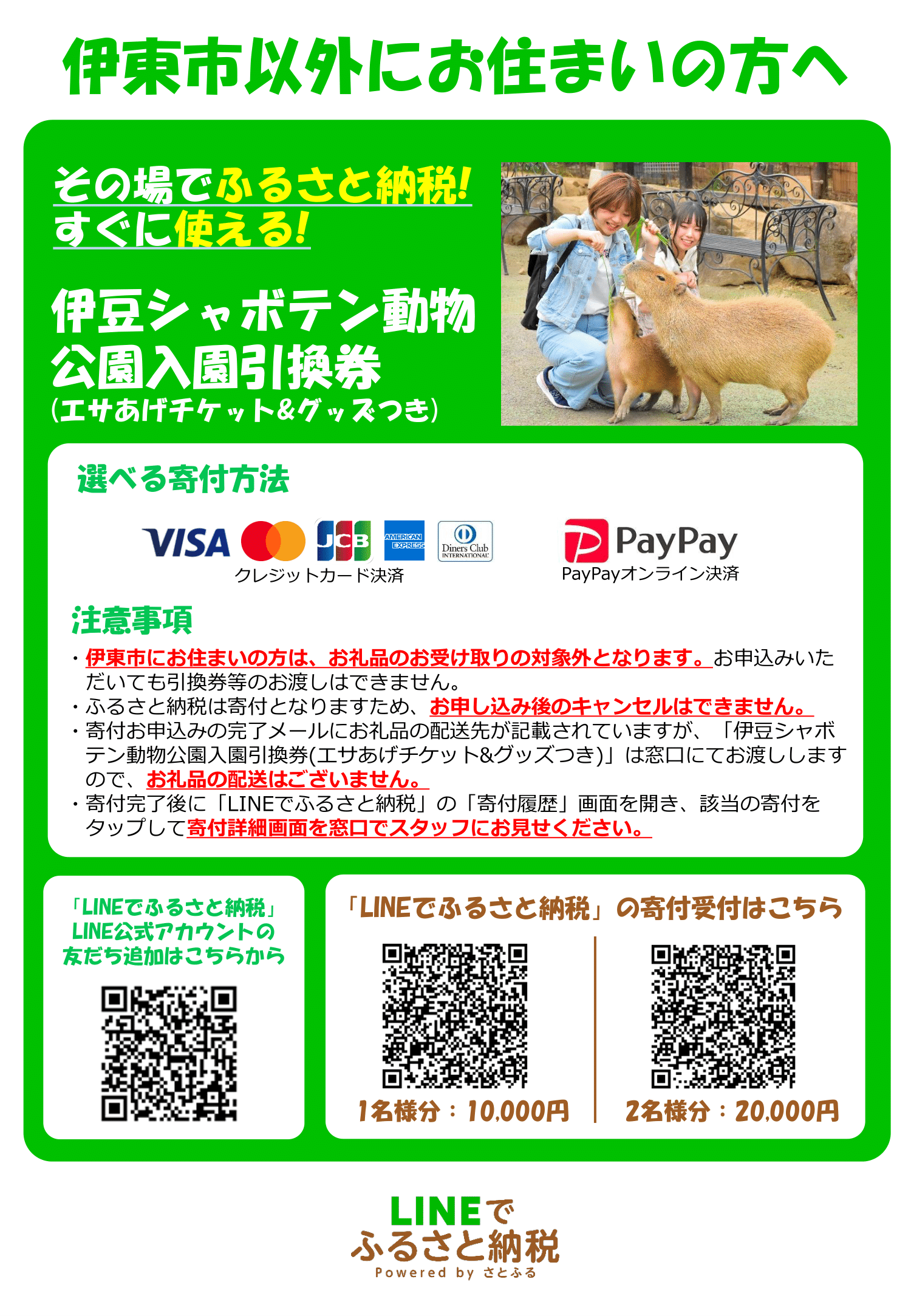 LINE株式会社(本社:東京都新宿区、代表取締役社長:出澤 剛)と、ふるさと納税ポータルサイト「さとふる」を運営する株式会社さとふる(本社:東京都中央区、代表取締役社長:藤井 宏明)は、LINEアプリを通じてふるさと納税が可能となる「LINEでふるさと納税 Powered by さとふる」(以下「LINEでふるさと納税」)において、現地を訪れた際に寄付申し込みをするとその場でアクティビティなどを楽しめる体験型ふるさと納税のお礼品提供を2022年9月22日より開始いたしましたのでお知らせいたします。また、同日より千葉県九十九里町「九十九里海釣りセンター」と静岡県伊東市「伊豆シャボテン動物公園」の2か所で寄付・利用できるようになるほか、今後、対象施設を増やしていく予定です。