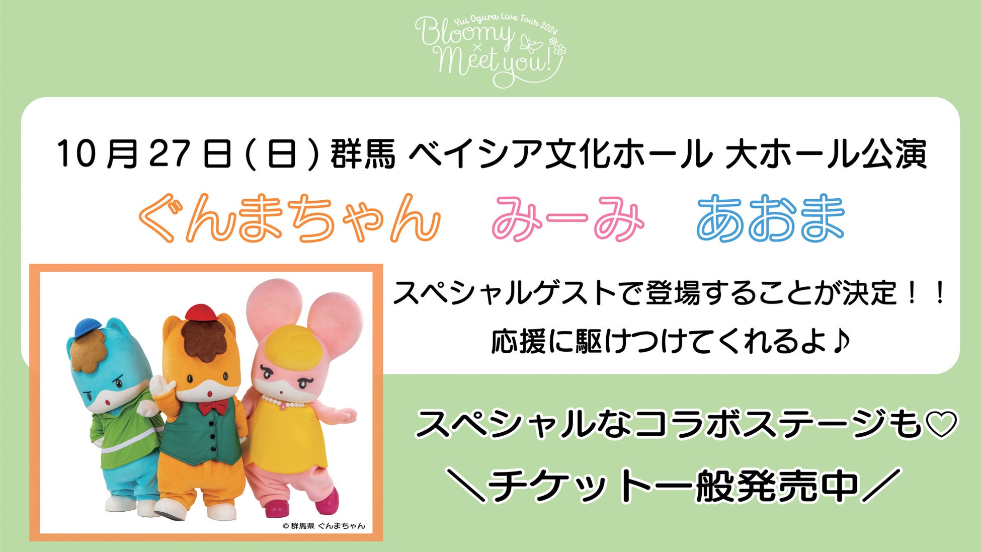 今回のライブでは最新情報も続々と発表された。まずは今年8月に開催された『小倉 唯 Birthday Event 2024"唯涼祭"~Cute or Cool?~』のライブパートをまとめたBlu-rayの発売、および本作のリリースイベントの開催が発表されたほか、小倉の地元・群馬公演(10月27日(日)開催)にご当地キャラクターのぐんまちゃん、みーみ、あおまがスペシャルゲストとして登場することが明らかとなった。