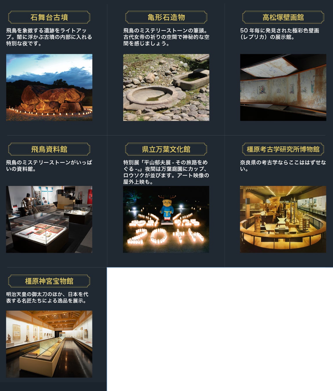 石舞台古墳・亀形石造物(日中・夜間) 高松塚壁画館・飛鳥資料館(日中のみ)