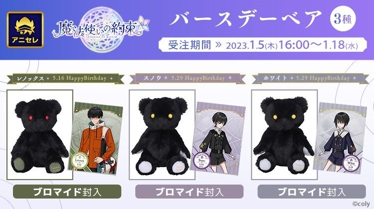 株式会社アニメイトは、受注生産商品プロジェクト『animate LIMITED SELECTION(通称アニセレ)』より、『魔法使いの約束』の「バースデーベア(レノックス、スノウ、ホワイト)」の発売を発表いたしました。