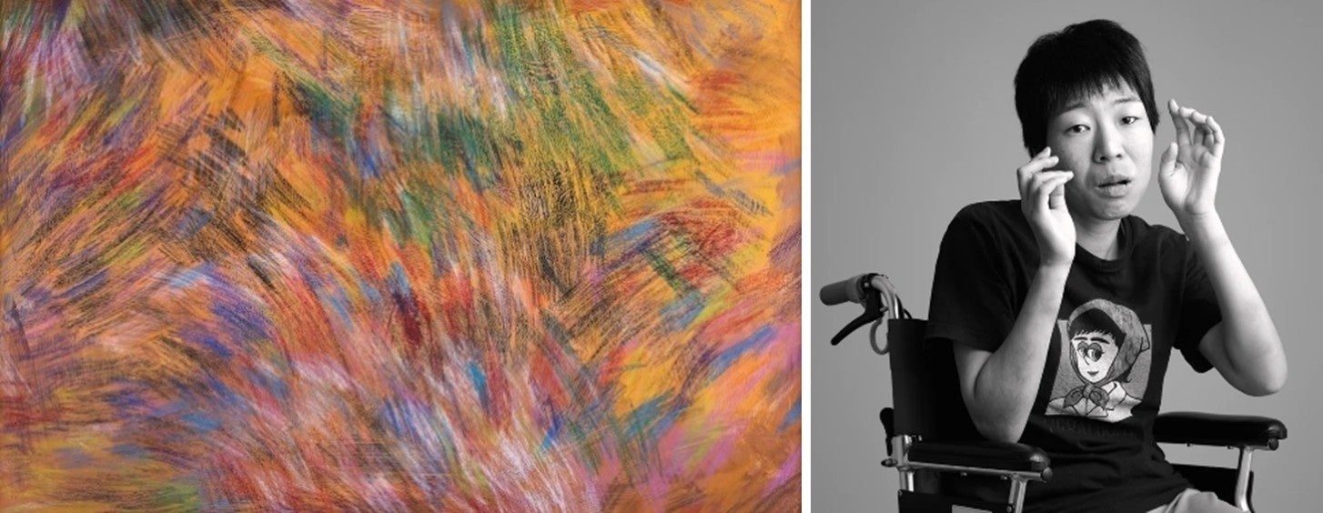色鉛筆やクレヨンを塗り重ねることでつくり上げられた作品は、一見すると、素早い鉛筆の動きを要する激しい制作態度を連想させる。しかし実は、彼女の制作は非常にゆっくりと穏やかである。彼女の描き出す一つひとつの色は、お互いに交じり合うことなく、それぞれにその美しさを主張しながら画面の上に現れ、激しさと静けさが不思議に同居しており、心を惹きつけられずにはいられない。