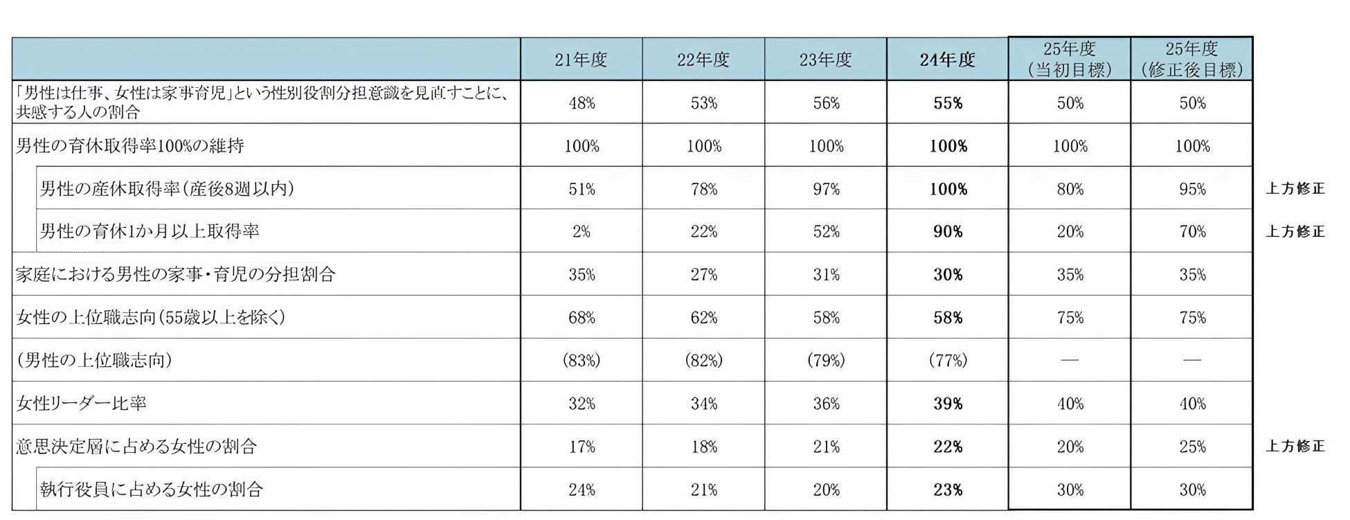 2013年度より女性活躍の重点指標として「女性イキイキ指数」を設定、2025年度までの目標数値を掲げ、取り組みを可視化しております。