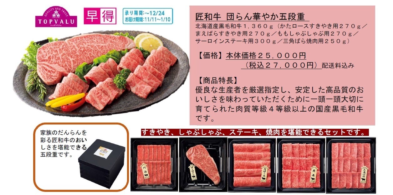 今年の年末年始は、家族や親戚、友人等と集い、リアルなふれあいを一緒に楽しむニーズが一段と高まると見込まれます。また、冬ギフトの自宅への配送需要も年々増加しており、「カジュアルギフト」や「パーソナルギフト」「お取り寄せ」等、用途の多様化が進んでいます。こうした中イオンは、肉質等級4等級以上の「トップバリュ 匠和牛」や食べやすくカットした「ボイルたらばボイルずわいがに食べ比べセット」、また、ギフトで特に人気の果物を詰め合わせた「フルーツ王国やまがた 果物詰め合わせ」等、生鮮品を中心に“集いを楽しむ特別なごちそう”の品揃えを充実させます。また、大切な方への贈り物としての利用はもちろん、お取り寄せでも楽しめる商品を集めた「ごほうびスイーツ&グルメ」を強化、さらに、「パーティスイーツ(クリスマス)」を本年初の取り組みとして展開します。一方、“節約志向”に対応し、食用油・調味料・珈琲等の実需型商品の高割引での展開は、前年比1.8倍に拡大します。