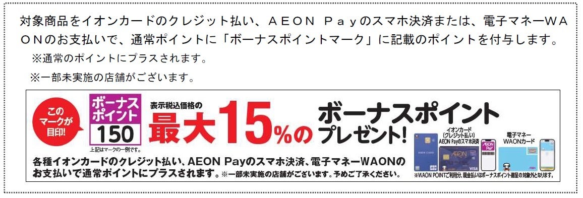【イオンカードのクレジット払い、AEON Payのスマホ決済、電子マネーWAONのお支払いで、ボーナスポイント付与実施】