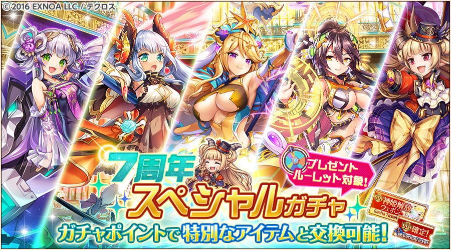 合同会社EXNOA(本社:東京都港区、CEO:村中 悠介、URL:https://games.dmm.com/)が運営するDMM GAMESにおいて『神姫PROJECT』は、リリース7周年を記念して毎日最高100連ガチャをまわせるルーレットガチャを開催する事を発表した。さらに豪華ログインボーナスや人気投票イベントも開催している。