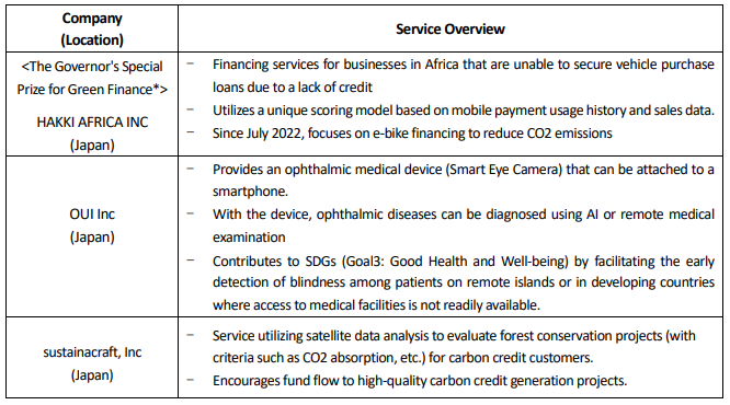 For details, please visit the Tokyo Financial Award website. https://www.finaward.metro.tokyo.lg.jp/en/