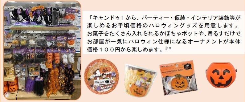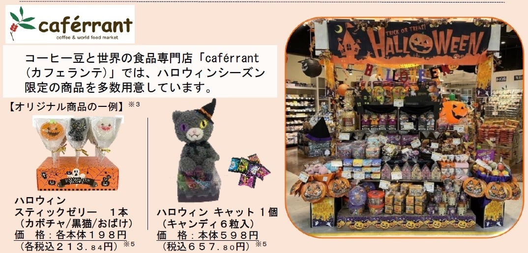 お手頃価格でパーティーや装飾等を楽しめるキャンドゥのグッズや“食のセレクトショップ”「カフェランテ」のオリジナル菓子等を用意し、ハロウィンのワクワク感を盛り上げます。