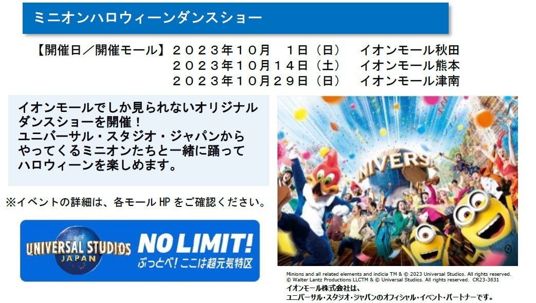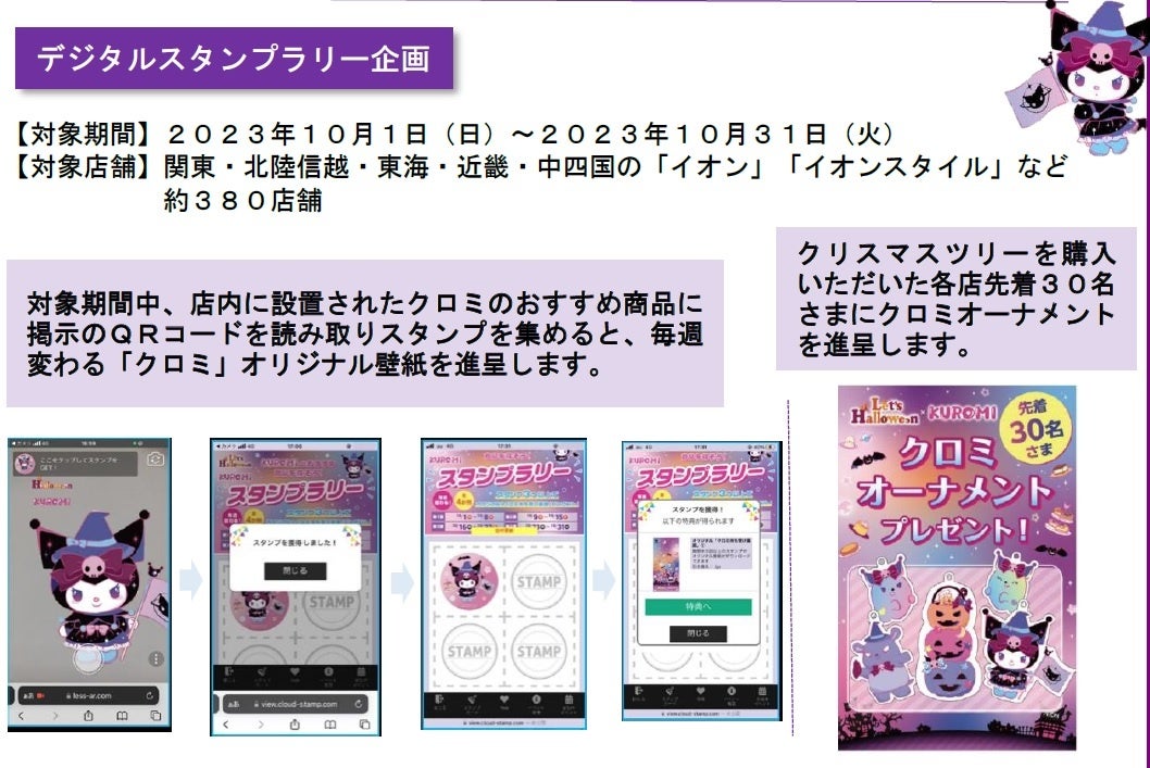 ハロウィンのワクワク感が高まるこの時期に、幅広いお客さまにお出かけ先としてのイオンをより一層楽しんでいただくため、株式会社サンリオキャラクター「クロミ」のオリジナル景品がもらえるキャンペーンや、イオンモールでしか見られないオリジナルダンスショー「ミニオン ハロウィーンダンスショー」等を用意し盛り上げます※2。