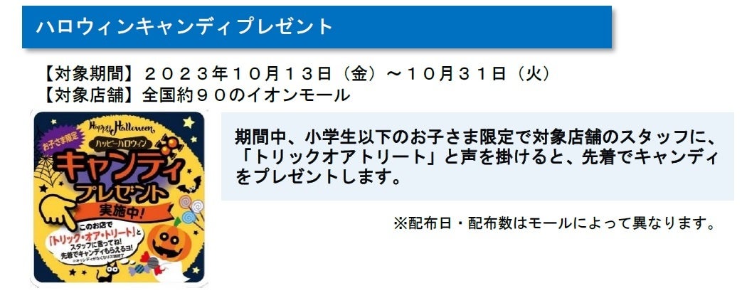 イオンは、9月29日(金)より順次、「イオン」「イオンスタイル」約380店舗と「イオンモール」約160モールにて、「イオンのハロウィン 2023」を開催します。※1