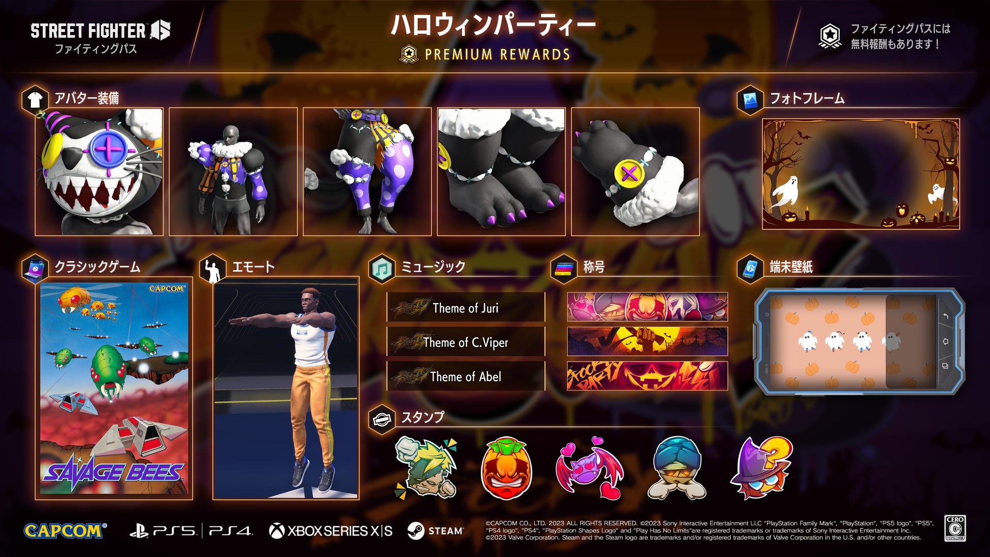 今回の「ファイティングパス」では、10月末の大イベント「ハロウィン」にピッタリな、どことなくあのキャラに似ているアバター衣装やキョンシー風のエモートなどが登場! また、懐かしのクラシックゲーム『SAVAGE BEES』(『超浮遊要塞エグゼドエグゼス』の海外版)や『ストリートファイターIV』の「ジュリ」や「クリムゾン・ヴァイパー」、「アベル」のテーマ曲もミュージックに登場する。アバターやスタンプを揃えてハロウィンを楽しもう!
