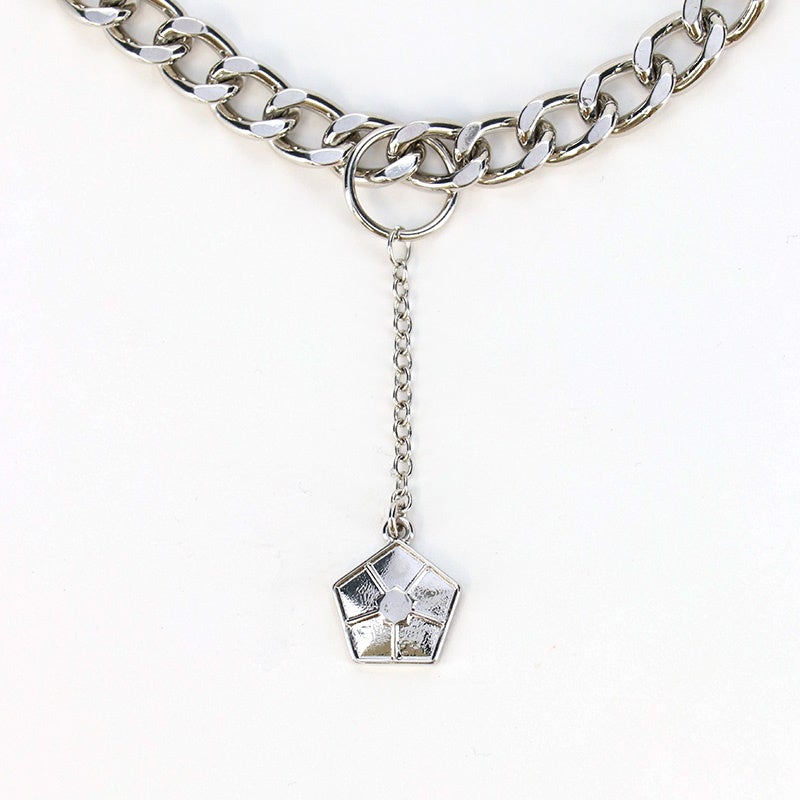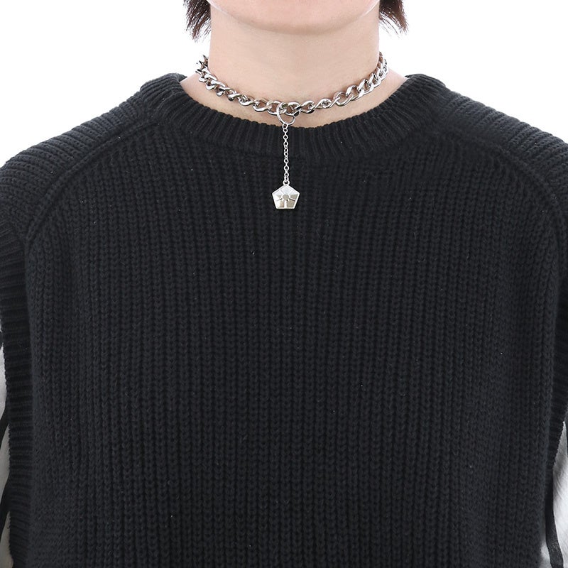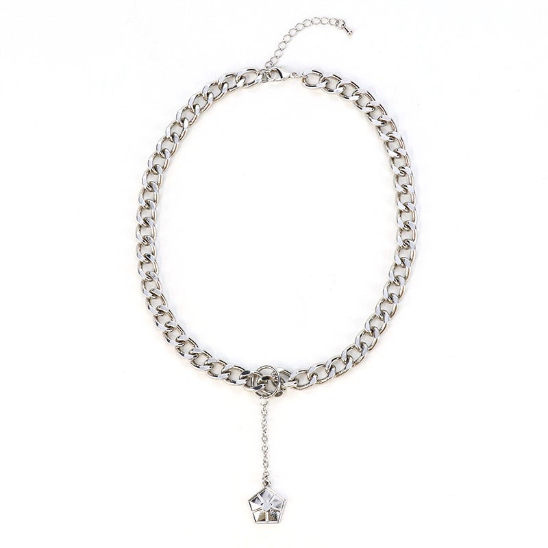 胸元で揺れる五角形のチャームが目を引きます。