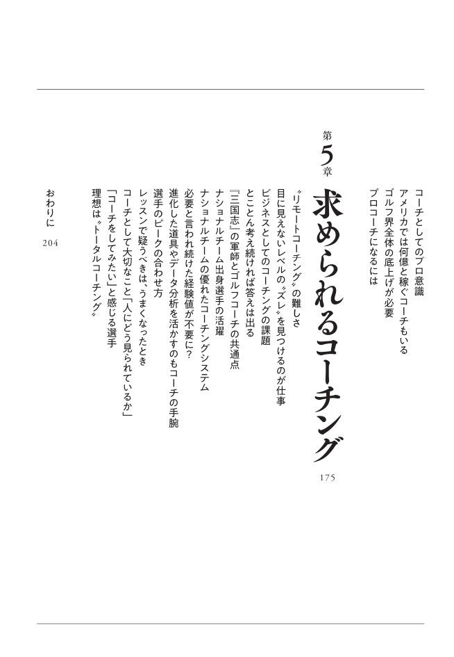 本書は、スポーツ読み物として気軽に楽しむことも、コーチングのヒントを探すこともできる内容となっています。ぜひ本書で「ゴルフコーチの世界」を知ってください。