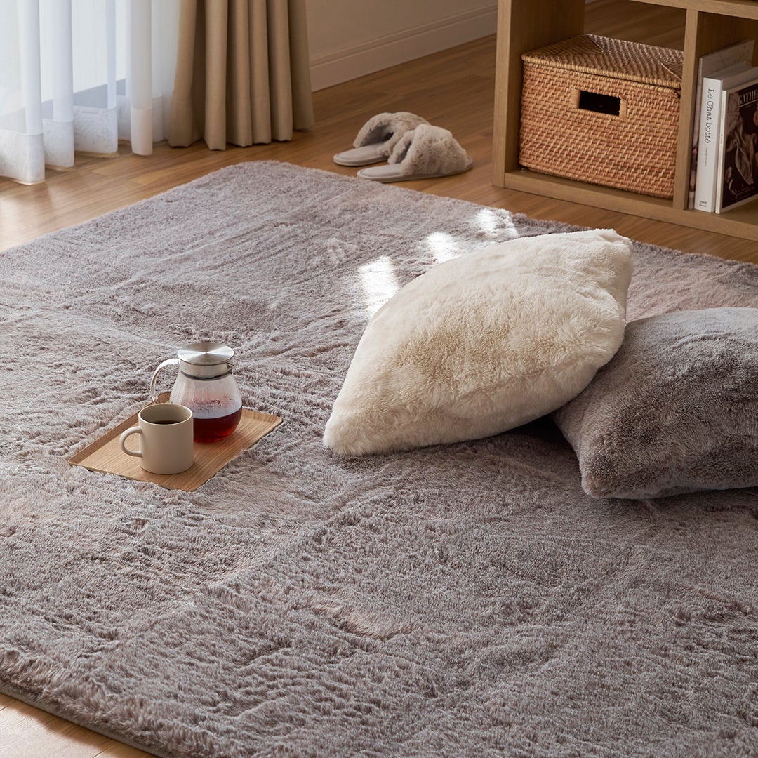 ふんわり、なめらかな肌ざわりで、手が埋もれるほどのふかふかなボリュームです。ラグとスリッパの裏面には滑り止めつきです。ラグの表面は嫌な臭いがつきにくい抗菌防臭機能付きです。