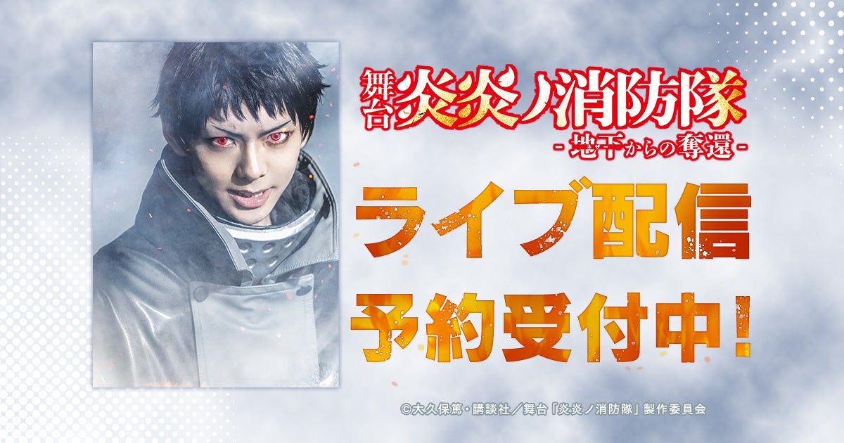 合同会社DMM.com(本社:東京都港区、会長 兼 CEO:亀山敬司 以下「DMM」)は「舞台「炎炎ノ消防隊」-地下からの奪還-」の2022年9月17日(土)18:00 初日夜公演、10月2日(日)17:00 千秋楽公演のライブ配信の予約販売を開始いたしました。ライブ配信は公演終了後も楽しめるディレイ配信付きです。ご自宅や外出先のパソコン、スマートフォン、テレビ画面でお楽しみください。
