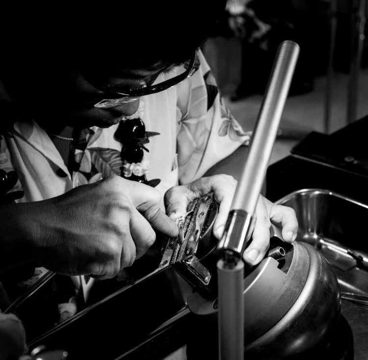 「ハワイアナ」のヘッドエングレーバーは、ハワイ現地で技術を習得し、現在でも毎年定期的にハワイを訪れ、現地のエングレーバーと技術共有を行うなど、彫刻技術を磨き続けています。「ハワイアナ」のすべての商品は、このヘッドエングレーバーによる監修を経て、皆さまのもとにお届けしています。