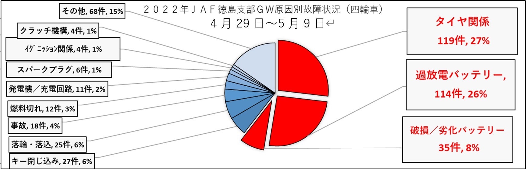 JAF徳島支部が実施したゴールデンウィーク中のロードサービス救援要請では、バッテリーとタイヤ関係のトラブルが全体の50%以上を占めます。日頃からクルマのコンディションをチェックする「日常点検」を実施することでトラブルを回避し、より安全にクルマを運転することができます。