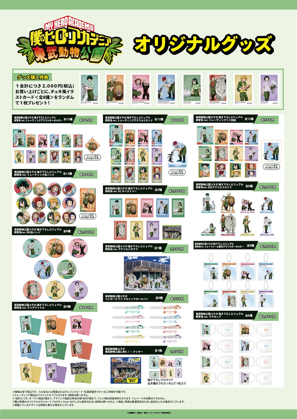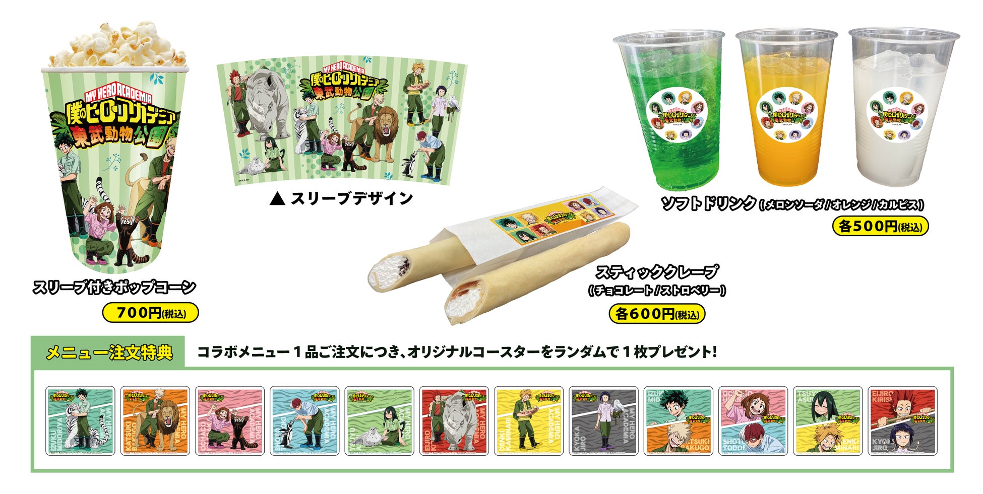 2022年5月28日(土)~8月31日(水)の期間中、ヒロアカの主人公・緑谷出久をはじめ1年A組の生徒たちが飼育係となり、それぞれが動物と並んだ描き下ろしビジュアルが登場します。そのビジュアルを使用したオリジナルグッズを販売し、さらにコラボフードやミニゲーム、特典付きコラボ入園券の販売など、本コラボでしか体験できないコンテンツをご用意いたします。