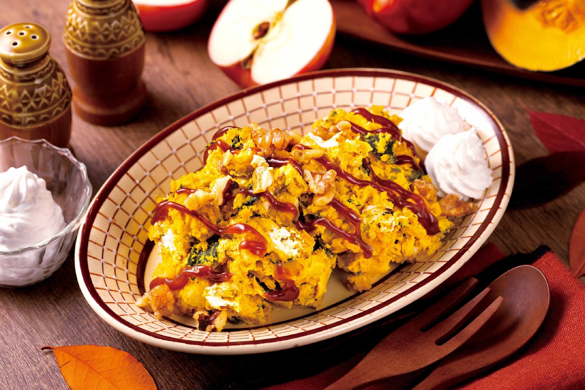 季節感のある南瓜にりんごとくるみを組み合わせたカボチャサラダ。ハロウィンを彩るキャラメル風味のソースで仕上げ、デザート感覚で楽しめるようホイップも添えました。南瓜の滑らかさの中にシャキシャキとしたりんごと香ばしいくるみの食感を楽しめます。