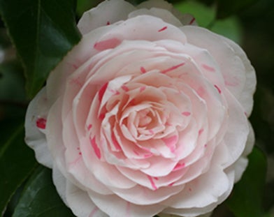 ‘神代桃錦(ジンダイモモニシキ)’は、神代植物公園のバックヤードに植えられていたツバキで、花の径が 6 ㎝程度に比して宝珠が大きく、重量感があり桃太郎の桃を思わせます。咲きはじめの形が桃の形に似て、花色が白色の地に濃紅色の筋模様が入ることから‘神代桃錦’と命名。昨年、新品種登録が認められました。