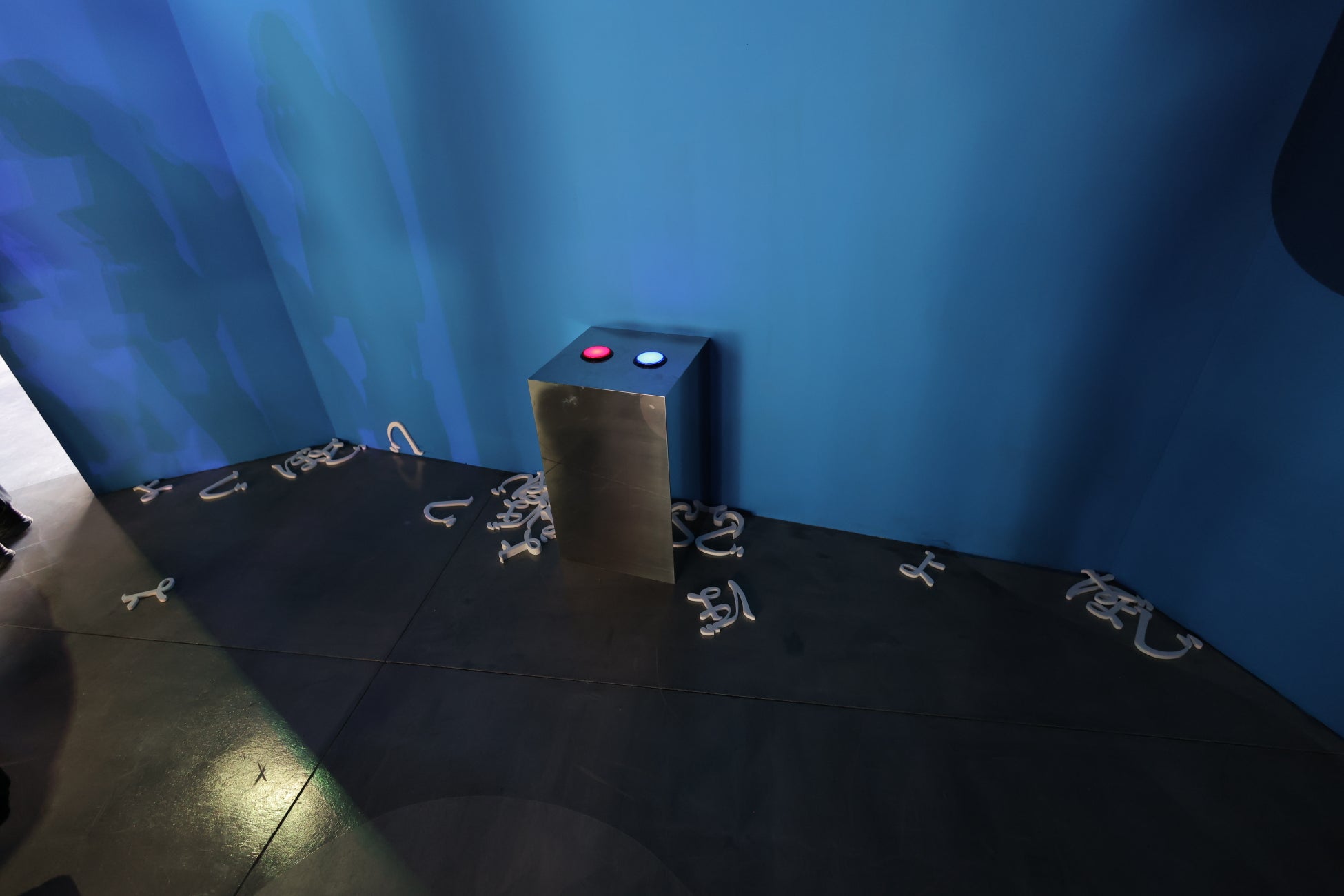 赤と青、二つのボタン。そのどちらかを押すと、言葉のような何かが頭上から現れ、跳ね返り、やがて地面に吸い込まれていく。