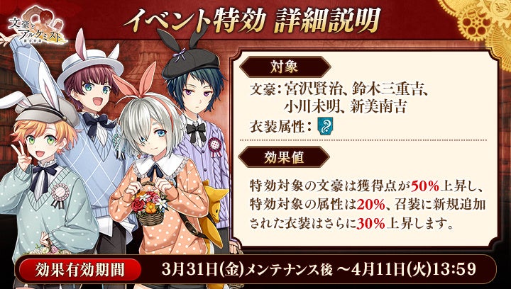 さらに、イベントと同時に開催される限定召装『ワニ太郎の大冒険』にて新規追加された「宮沢賢治」「鈴木三重吉」「小川未明」の〈イースター風衣装〉を編成すると、得点の獲得率がそれぞれ30%上昇します。
