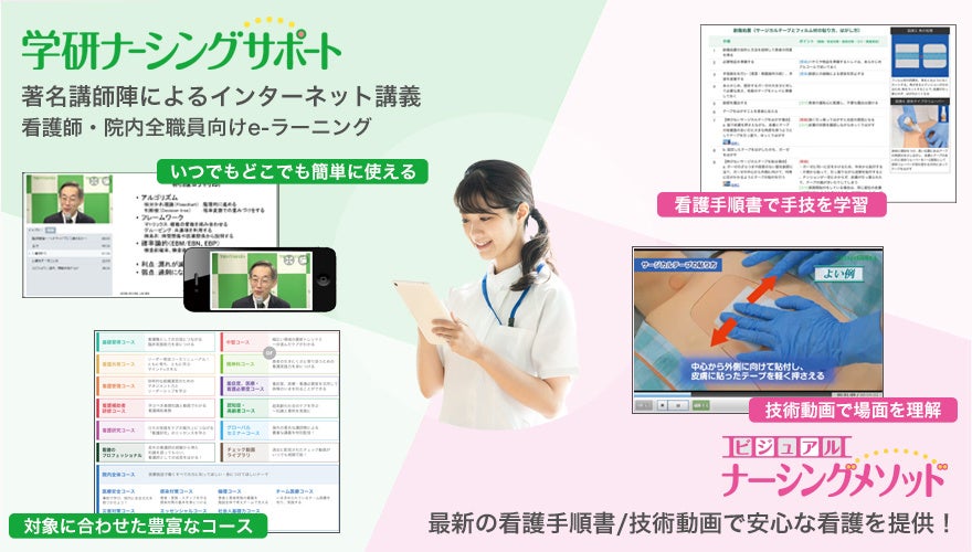 看護師をはじめとする院内全職員向けのe-ラーニングサービスです。著名な講師陣の講義を視聴することができます。新人看護師向けや管理職向けなどあらゆるニーズに合わせたコースをご用意しています。