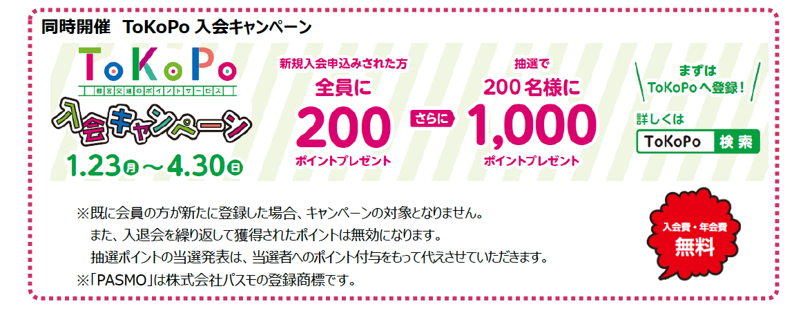 今回の冬の時差Bizキャンペーンは、期間中最大750ポイントをプレゼントします。併せて、都営交通ポイントサービス「ToKoPo(トコポ)」入会キャンペーンも1月23日(月)から実施します。まだ入会されていない方は、是非この機会にお申し込みください。