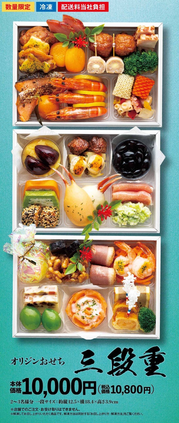 ※三段重は『冷凍おせち』です。お受け取り後は「冷凍庫」で保管し、同封されている『お召し上がり方・解凍方法』をご確認ください。また、店舗でのご注文およびお受け取りはできません。