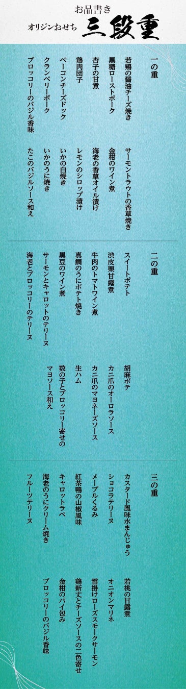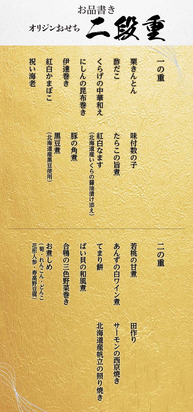 伝統的な「オリジンおせち二段重」、洋風に仕立てた「オリジンおせち三段重」もございます。