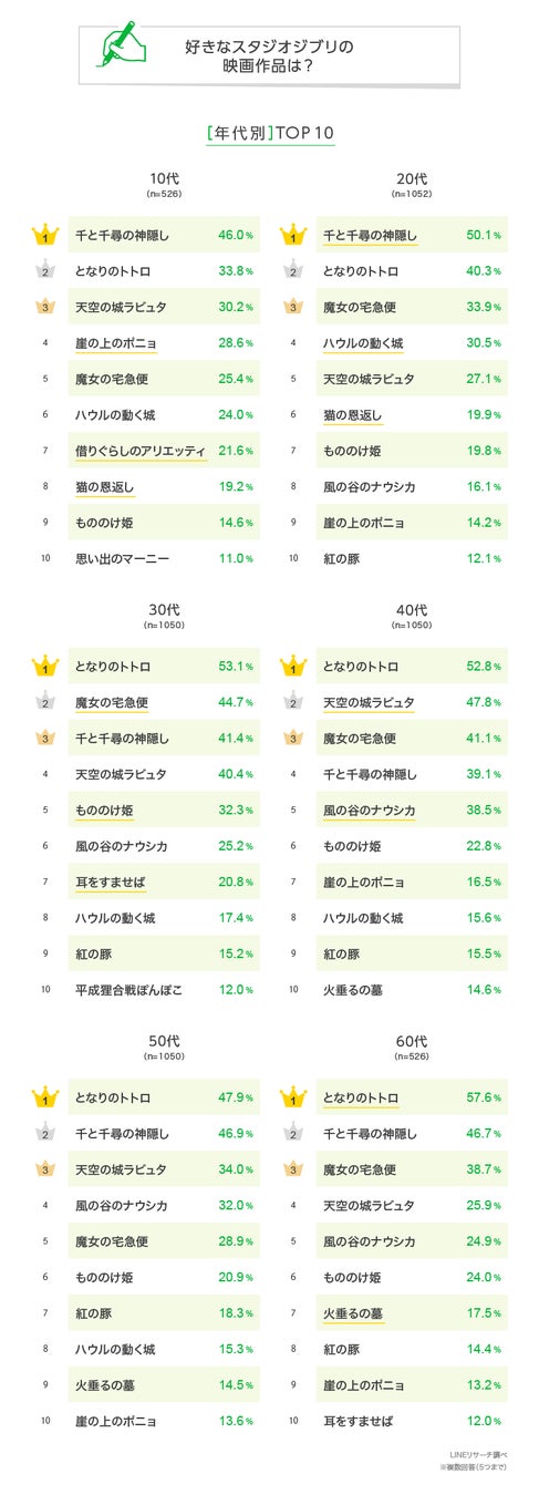 【LINEリサーチ】好きなジブリ作品は「となりのトトロ」「千と千尋の神隠し」が上位にランクイン、年代別では異なる結果に
