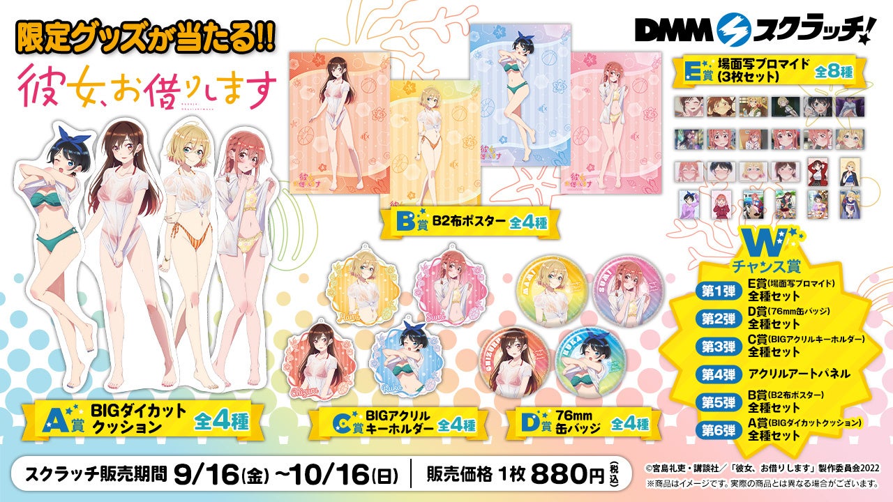 2022年9月16日(金)より、TVアニメ「彼女、お借りします」 スクラッチ第三弾(税込880円)を販売いたします。作品の世界観が楽しめる実用的な限定グッズが盛りだくさん!
