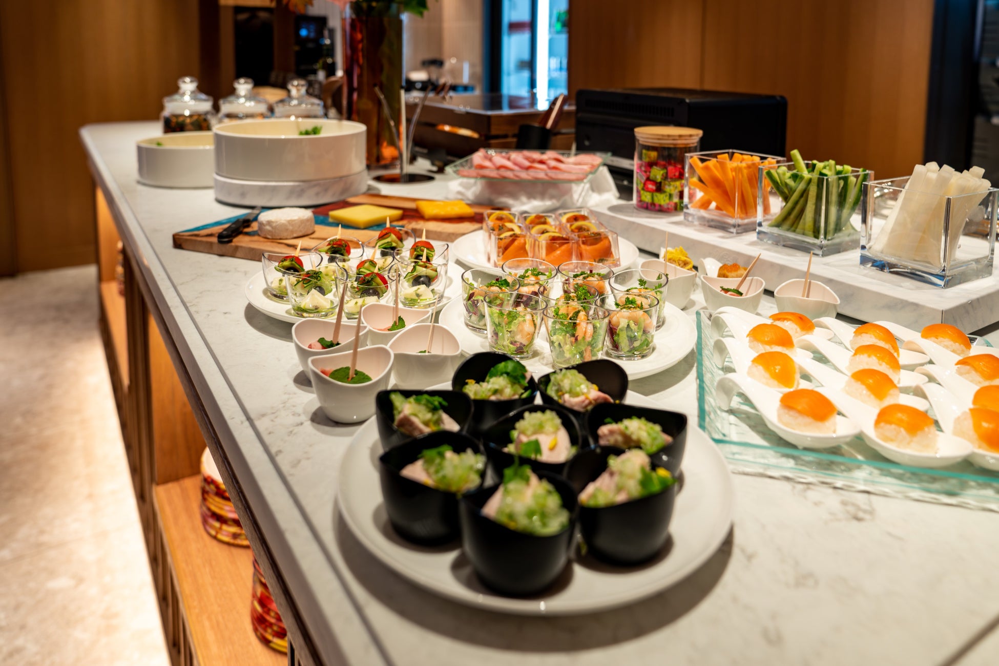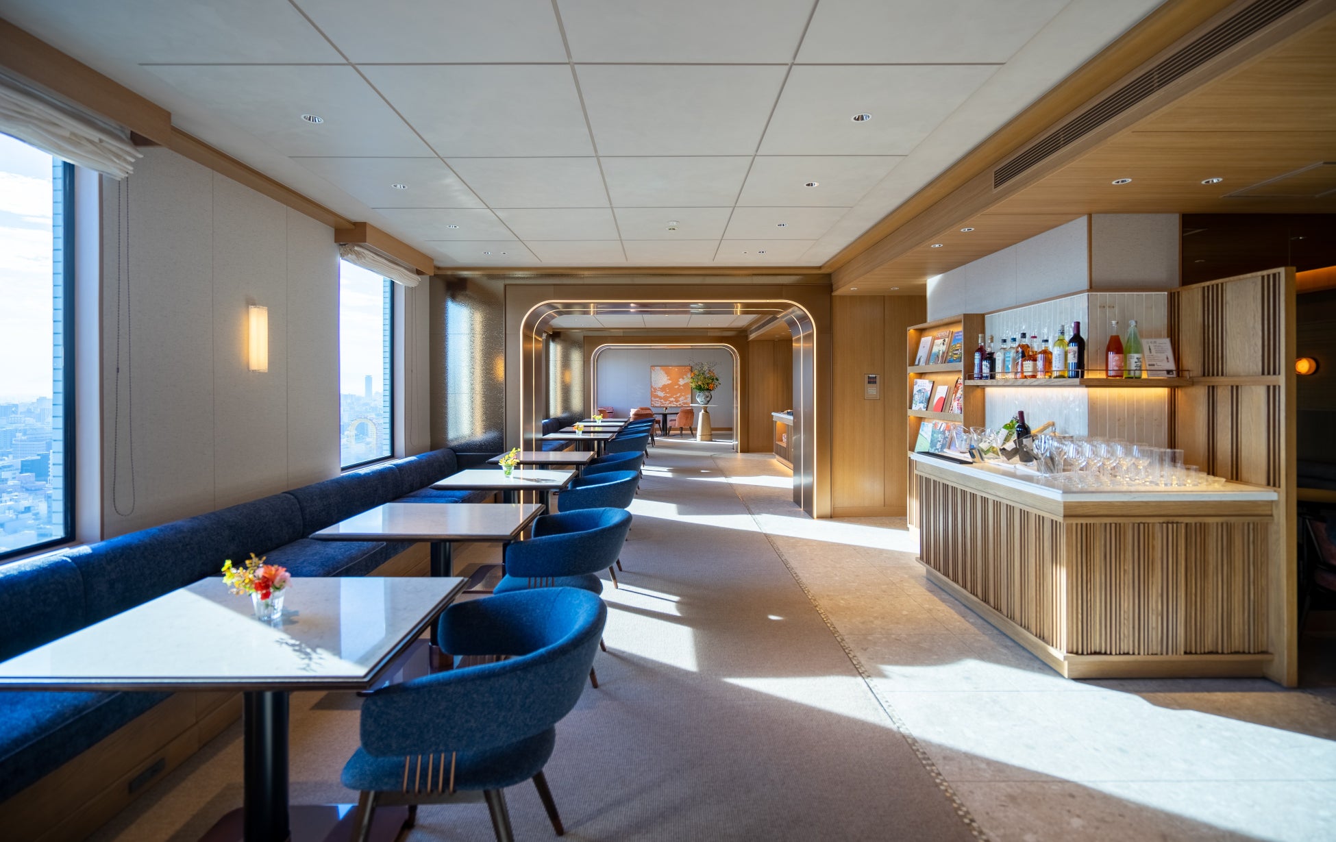 エレベーターホールからは、雲をイメージした絨毯と両サイドを照らすライン照明がラウンジへと誘います。エントランス正面には象徴的なフラワーアレンジメントを、右手にはコンシェルジュデスクを配置。ラウンジエリアには、ベンチシートやソファなど、コーナーごとに趣の異なる座り心地の良い椅子を配しています。さらに、モーニングタイム(ライトミール)、ティータイム、カクテルタイムにフードとドリンクをご提供するブッフェコーナー、グループ利用や会議のご要望に対応する個室を備えています。