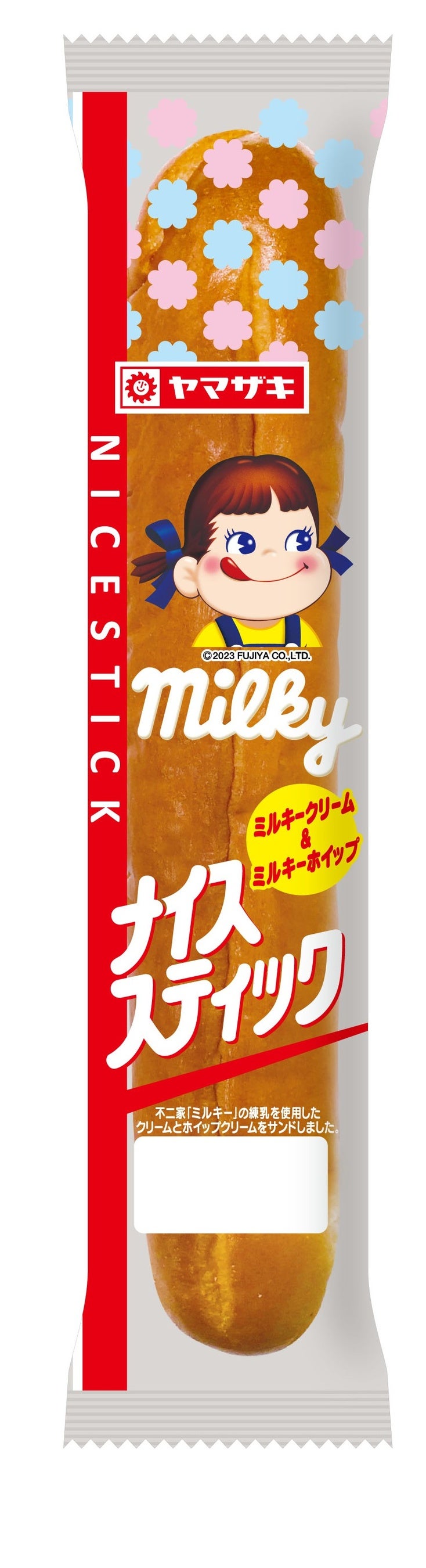 不二家のミルキークリームとミルキーホイップをスティックパンでサンドしています。