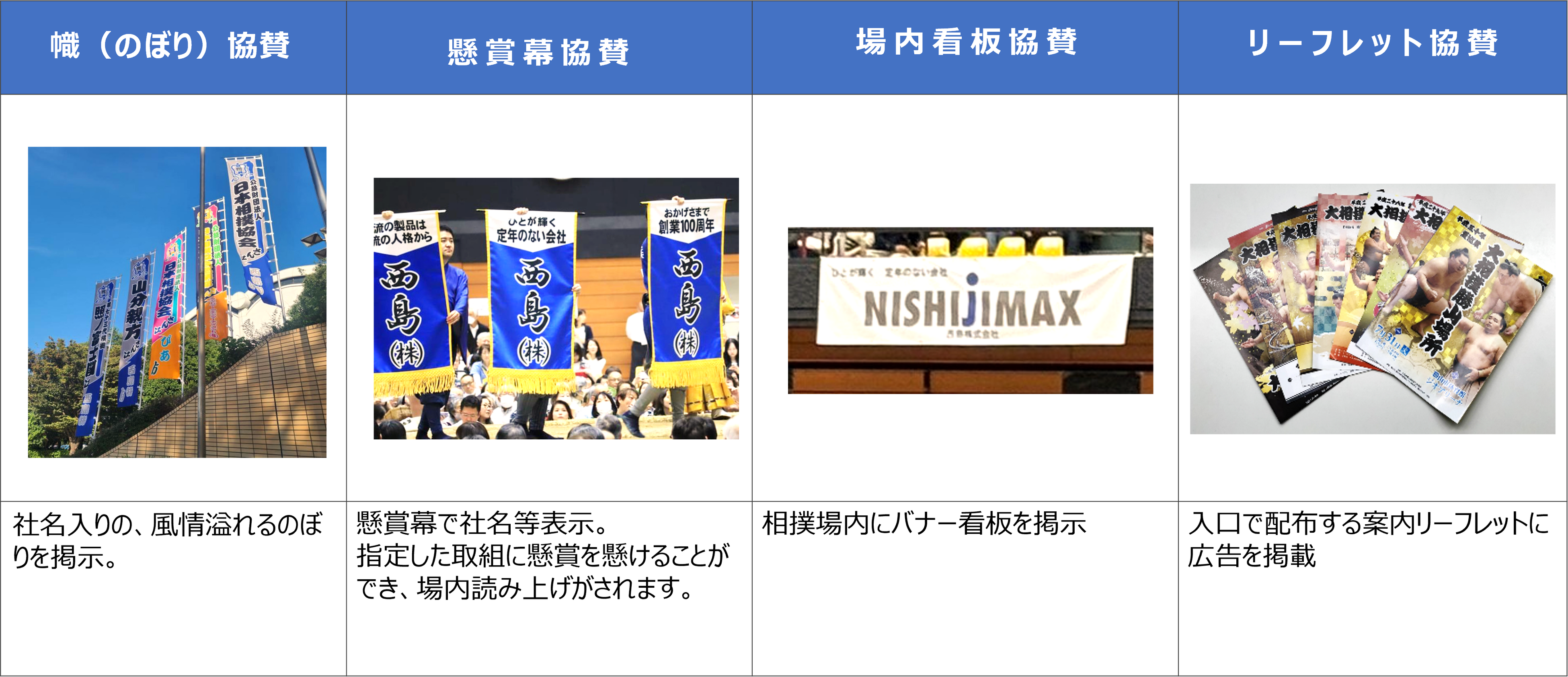 入口でお渡しするリーフレット、大注目の場内看板や、相撲の風情あふれる“のぼり”などご用意しております。さらにテレビでも見る、懸賞幕で取り組みに賞金を懸けることも可能です。