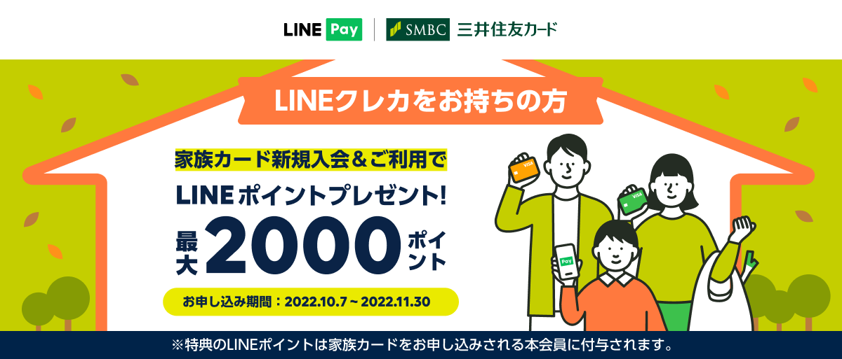 キャンペーン期間中、LINEクレカユーザーを対象に「家族カード」の新規入会とご利用でLINEポイント最大2000ポイントをプレゼント(本会員1名につき、対象となる家族カードは1名分のみとなります。)