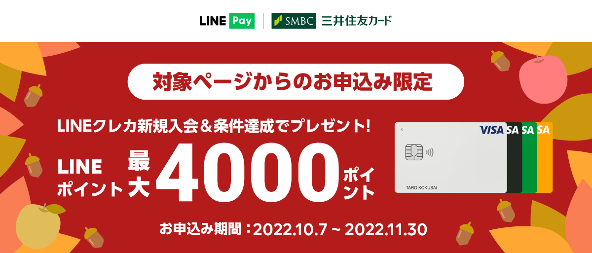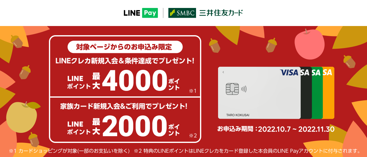 LINE Pay株式会社(本社:東京都品川区、代表取締役社長CEO:前田 貴司)は、2022年10月7日(金)から2022年11月30日(水)まで、Visa LINE Payクレジットカード(以下、LINEクレカ)に新規ご入会いただき、キャンペーンの条件を達成された方に、最大LINEポイント4000ポイントをプレゼントする「秋の感謝祭」を開催いたします。あわせて、LINEクレカユーザーを対象に、「家族カード」の新規入会とご利用でLINEポイント最大2000ポイントをプレゼントする「LINEクレカ 家族カード新規入会キャンペーン」を開催いたします。両キャンペーンの条件を達成すると最大でLINEポイント6000ポイントをプレゼントいたします。