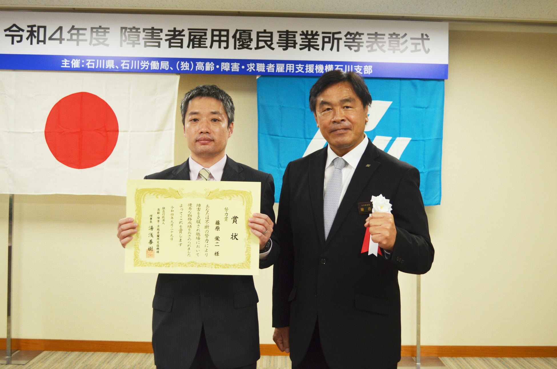 独立行政法人 高齢・障害・求職者雇用支援機構石川支部では、障害者の職業的自立の増進、障害者雇用の促進と職場定着を図る取り組みを行っています。今回は、障害者を積極的に多数雇用された事業所、模範的職業人として長期に勤続されている優秀勤労障害者の表彰式を開催し、当社のビジネスクリエーション部在籍の藤原栄二が受賞しました。当社社員が同賞を受賞するのは、平成30年度独立行政法人高齢・障害・求職者雇用支援機構理事長努力賞に続き、2回目です。