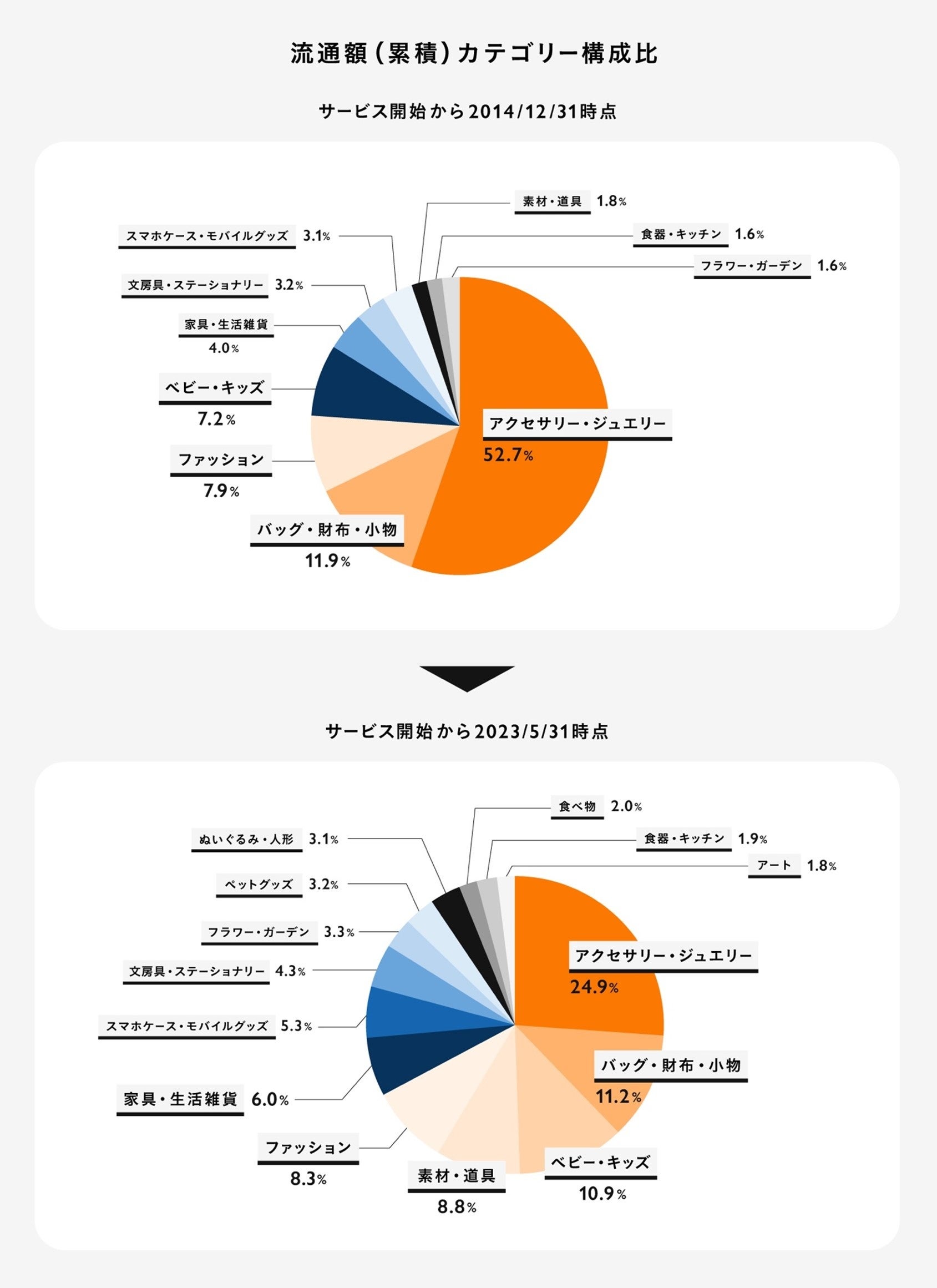 それにより、作家・ブランド数や作品数が継続的に増加し、2023年5月末時点で87万件を超える作家・ブランドによる1,635万点以上が販売される1,000億円のハンドメイドマーケットへと成長しました。