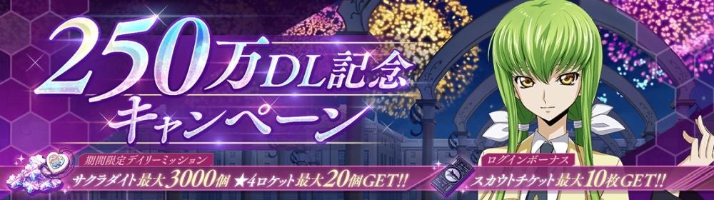 合同会社EXNOA(本社:東京都港区、CEO:村中 悠介、URL:https://games.dmm.com/)が運営するDMM GAMESと株式会社f4samurai(本社:東京千代田区、CEO:金 哲碩、URL:https://www.f4samurai.jp/)は、スマートフォン・PC向けゲーム『コードギアス 反逆のルルーシュ ロストストーリーズ』にて、累計ダウンロードが250万を突破したことをお知らせいたします。また、これを記念した「250万DL記念キャンペーン」「250万DL記念 日替わりピックアップスカウト」を開催することをお知らせいたします。