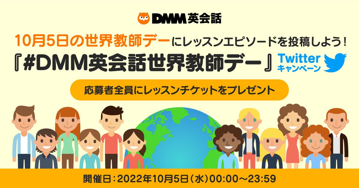 合同会社DMM.com(本社:東京都港区、会長 兼 CEO 亀山敬司、https://dmm-corp.com / 以下DMM )で展開中の「DMM英会話」( https://eikaiwa.dmm.com/ )は、10月5日(水)の「世界教師デー」(※1)を記念した特別企画として、世界中の講師とのレッスンエピソードを募集する『#DMM英会話世界教師デー』Twitterキャンペーンを開催します。
