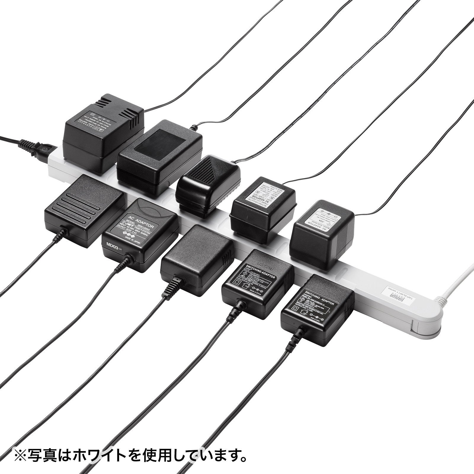 差込口がタップ本体の上面・側面交互に配置されており、さらに各差込口との間隔が50mmあるため、ACアダプタを差し込んだ場合でも隣に干渉することなく、すべての差込口を使用できます。スリムな形状で、接続に便利な電源タップです。